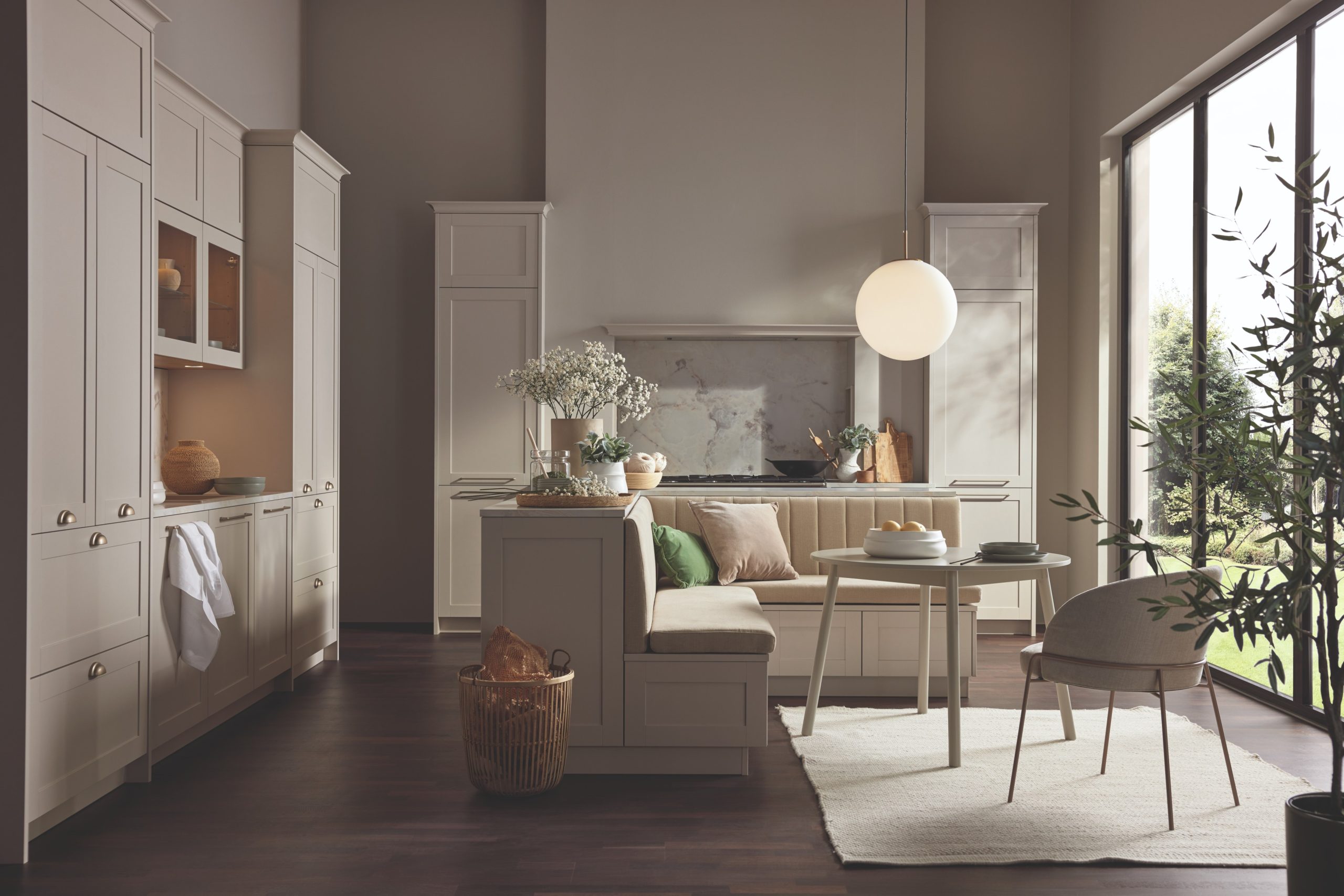 Combine with marble bianco worktops or natural wood accents for a kitchen that evokes tranquillity, warmth, and effortless sophistication, a true modern take on the classic country kitchen.