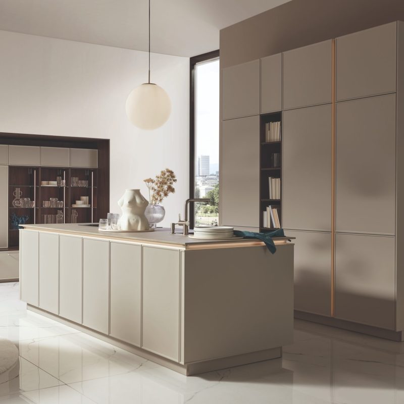 When combined with white lacquered fronts, the LEAF creates a light, modern contrast that feels fresh yet timeless. The result is a kitchen that feels connected to nature while remaining unmistakably contemporary.