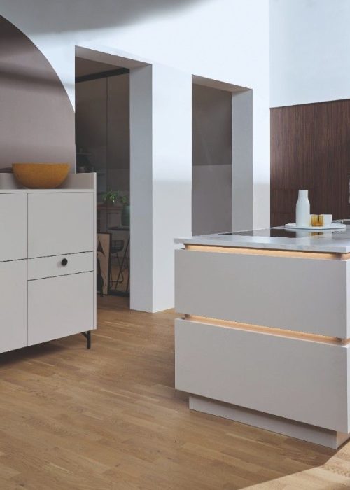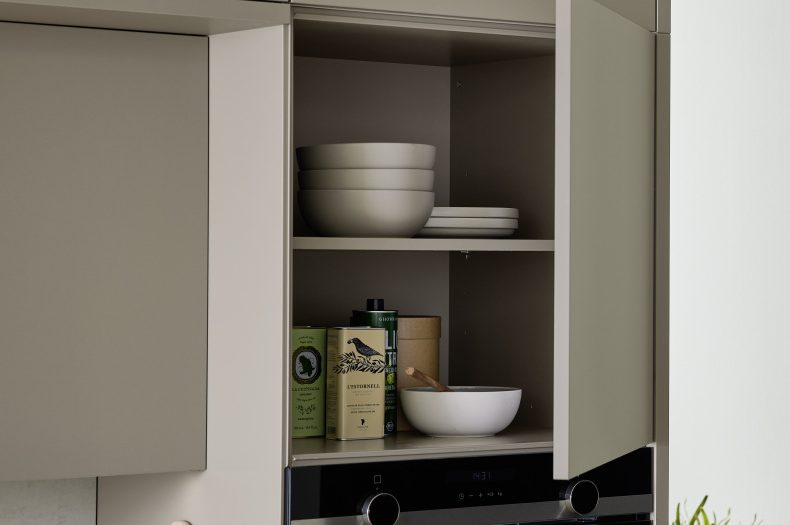 The clean, slab-style fronts, available in our MatrixArt handleless system if you choose, lend Velluto a seamless, minimalist aesthetic, creating a calming, cohesive look throughout open-plan spaces. Monochromatic options are easy to achieve with matching handless trims and carcasses, especially in the rich lava tone, allowing you to design an integrated, clutter-free environment.